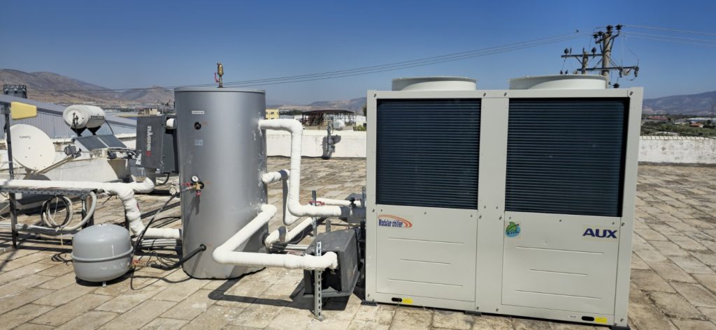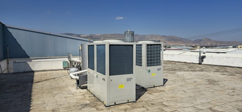 Replacement of an old heat pump with two state-of-the-art modular AUX chillers, with capacities of 35 kW and 60 kW (total 95 kW), fully meeting the building’s heating and cooling needs.